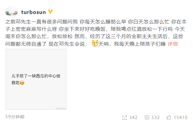 孙俪表示,邓超经历了三个月的全职主夫生活后,再也不问自己平时怎么那么忙了,“看吧,很多问题不用解释,经历一下就好了”。